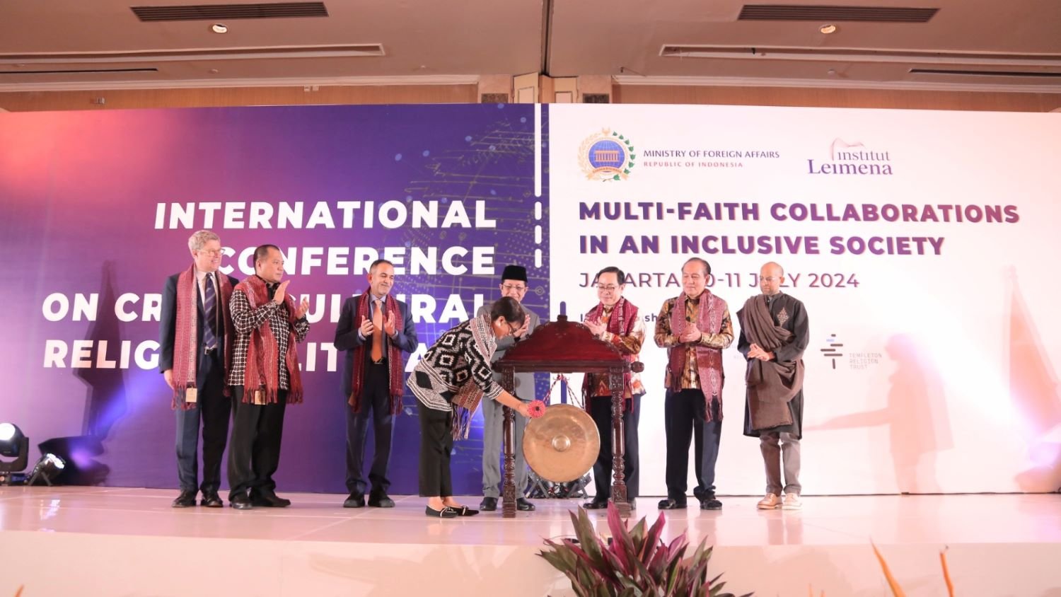 The Minister of Foreign Affairs, Retno Marsudi, struck the gong to open the International Conference, accompanied from left to right by: Director of the International Center for Law and Religion Studies, Brigham Young University Law School, Dr. Brett Scharffs; Director General of Human Rights, Ministry of Law and Human Rights, Dr. Dhahana Putra; Secretary General of the Higher Committee of Human Fraternity, United Arab Emirates, Dr. Khalid Al Ghaith; Grand Imam of Istiqlal Mosque, Nasaruddin Umar; Executive Director of the Leimena Institute, Matius Ho; Member of the Leimena Institute Association, Theo Sambuaga; and Program Director of Templeton Religion Trust, Iqbal Akhtar.