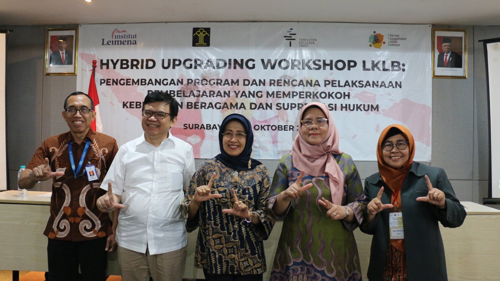 Speakers at the Hybrid Upgrading Workshop on CCRL, from left to right: Yudiono from the Human Resources Development Division of Gloria School Surabaya, Program Coordinator for Alumni of Institut Leimena, Daniel Adipranata, Senior Expert Staff at the Presidential Staff Office (KSP) of the Republic of Indonesia and Senior Fellow of Institut Leimena, Prof. Dr. Siti Ruhaini Dzuhayatin, Director of Human Rights Cooperation at the Ministry of Law and Human Rights of the Republic of Indonesia, Dr. Harniati, and Umi Sarofah, M.Pd. from the Forum of Principals of Muhammadiyah Schools in East Java.