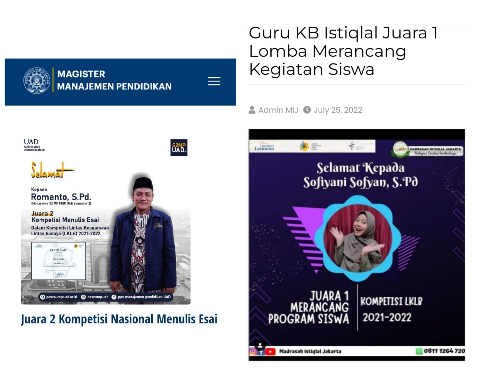 Beberapa contoh karya pemenang kompetisi diantaranya esai yang ditulis oleh Kepala Madrasah MA 1 Muhammadiyah Weleri, Kabupaten Kendal, Jawa Tengah, Romanto (01170) berjudul “Merindu Sekolah Inklusif Berbasis Literasi Keagamaan Lintas Budaya”. Karya yang menegaskan pentingnya peranan guru berwawasan LKLB itu berhasil meraih juara II.