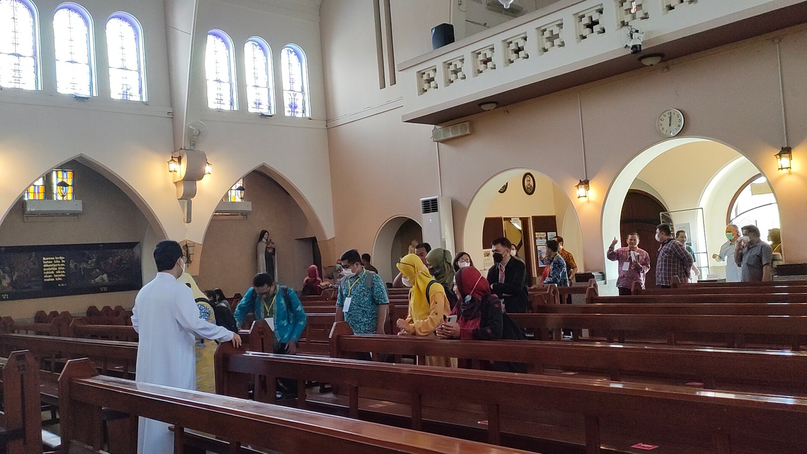 Para peserta dan fasilitator workshop penyusunan program dan rencana pelaksanaan pembelajaran berbasis Literasi Keagamaan Lintas Budaya (LKLB) dalam kunjungan ke Gereja Katedral Ijen, Malang, Jawa Timur.