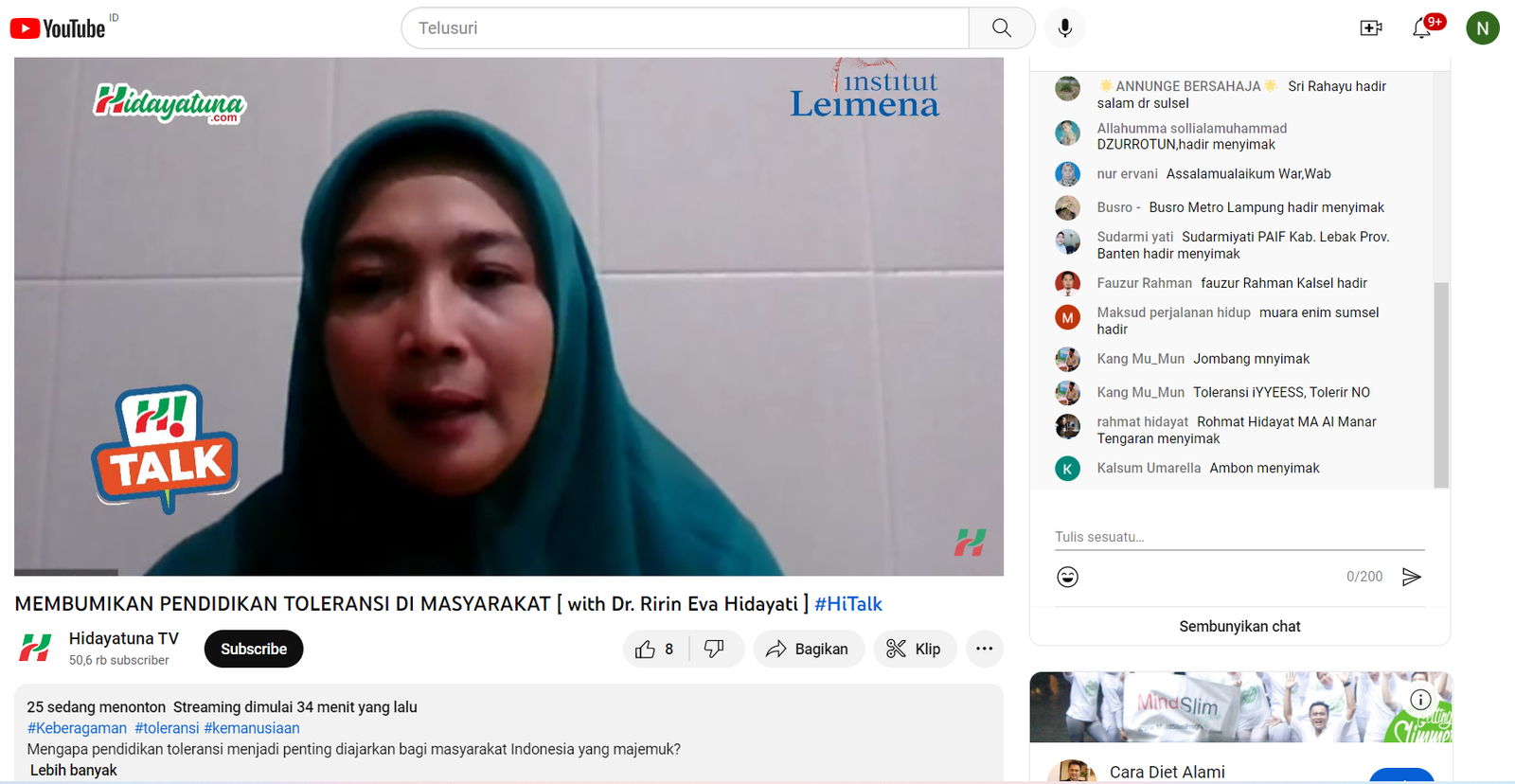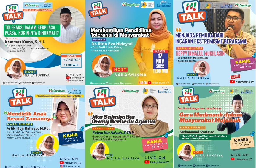 Sejak Januari 2022, Institut Leimena bekerja sama dengan media Hidayatuna.com telah mengadakan acara “HiTalk Seri Literasi Keagamaan Lintas Budaya” yaitu siaran live talkshow yang ditayangkan pada YouTube HidayatunaTV. Isinya membahas berbagai isu terkait materi LKLB yang bisa diakses lewat tautan https://www.youtube.com/@HidayatunaTV/streams.