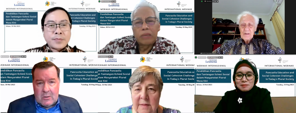 Para pembicara dan narasumber dalam webinar internasional yang diadakan oleh Institut Leimena bertemakan “Pendidikan Pancasila danTantangan Kohesi Sosial dalam Masyarakat Plural Masa Kini”, Selasa (30/5/2023) malam.
