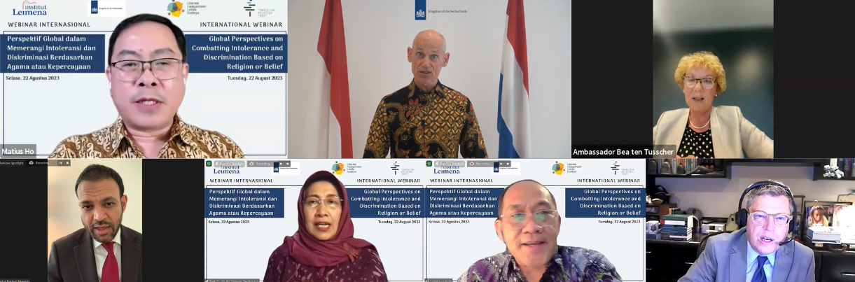 Para pembicara dalam Webinar Internasional Seri Literasi Keagamaan Lintas Budaya bertemakan “Perspektif Global dalam Memerangi Intoleransi dan Diskriminasi Berdasarkan Agama atau Kepercayaan yang diadakan Kedutaan Besar Kerajaan Belanda Jakarta dan Institut Leimena, Selasa (22/8/2023).