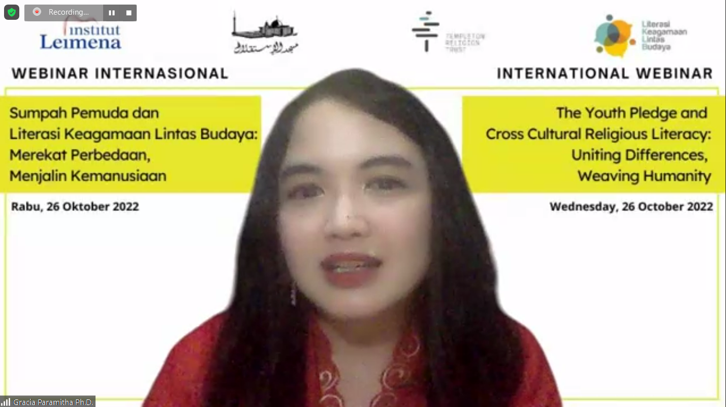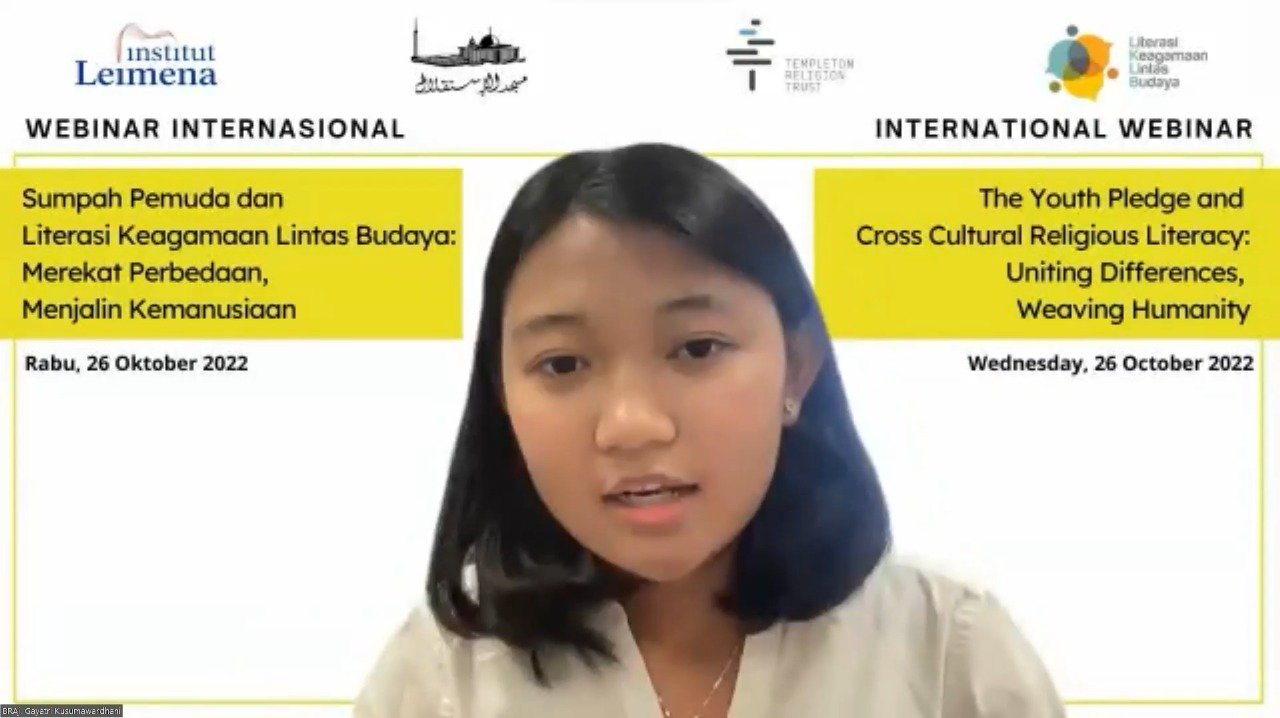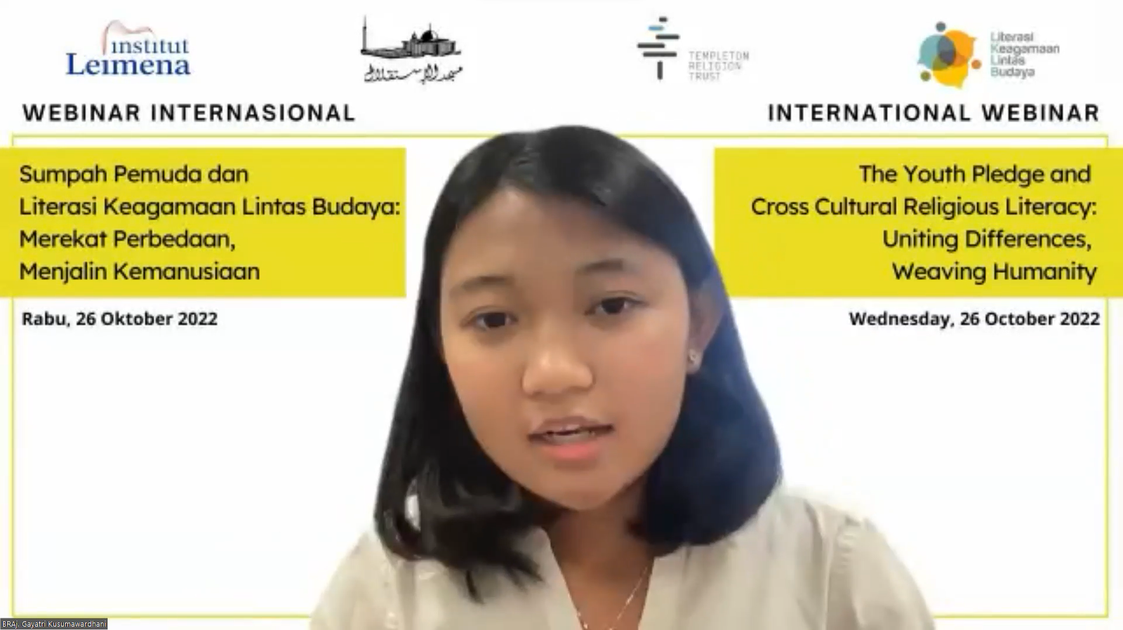 “Pengalaman saya hampir satu tahun menjabat ketua OSIS di sekolah Katolik sebagai seorang Muslim, saya betul-betul belajar apa itu artinya memahami dan apa itu arti toleransi,” kata Gayatri dalam Webinar Internasional bertajuk “Sumpah Pemuda dan Literasi Keagamaan Lintas Budaya: Merekat Perbedaan, Menjalin Kemanusiaan”, Rabu (26/10/2022) malam.