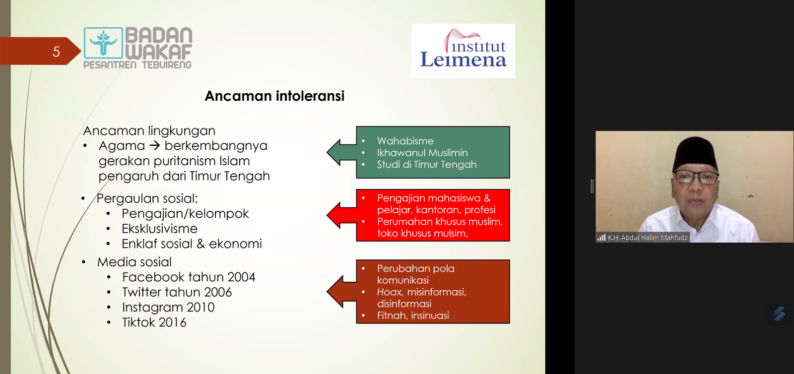 “Intoleransi dan radikalisme semakin menguat karena ada beberapa bidang penyebabnya yaitu agama, pergaulan sosial, apalagi yang menggunakan media sosial,” kata Abdul Halim dalam webinar internasional yang diadakan BWPT dan Institut Leimena dengan topik “Peran Pesantren Dalam Literasi Keagamaan Untuk Mencegah Perpecahan dan Memperkuat Kerjasama Antar Umat Beragama”, Selasa (22/11/2022) malam.