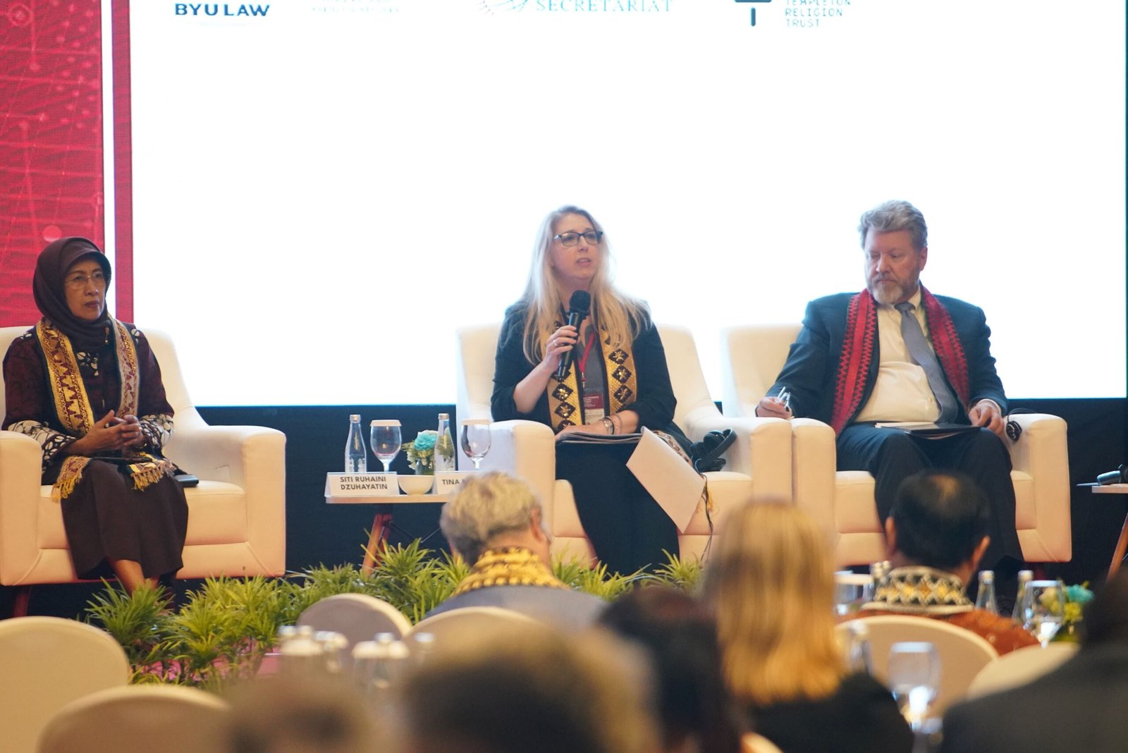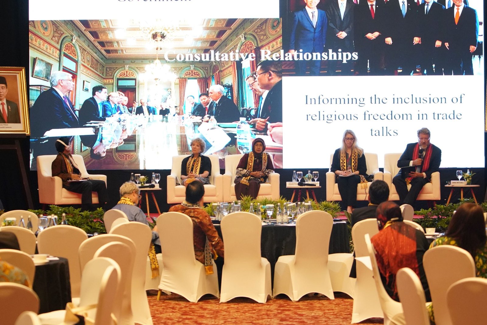 Executive Director of Maarif Institute Abd. Rohim Ghazali (moderator), Senior Advisor to the Executive Office of the President (KSP) Siti Ruhaini Dzuhayatin, Special Envoy for Freedom of Religion or Belief, Ministry of Foreign Affairs of the Kingdom of the Netherlands, Bea ten Tusscher, Senior Advisor for East Asia Pacific and South Asia at the Office of International Religious Freedom, U.S. Department of State, Tina Mufford, as well as Founder of the International Religious Freedom Secretariat, Greg Mitchell.