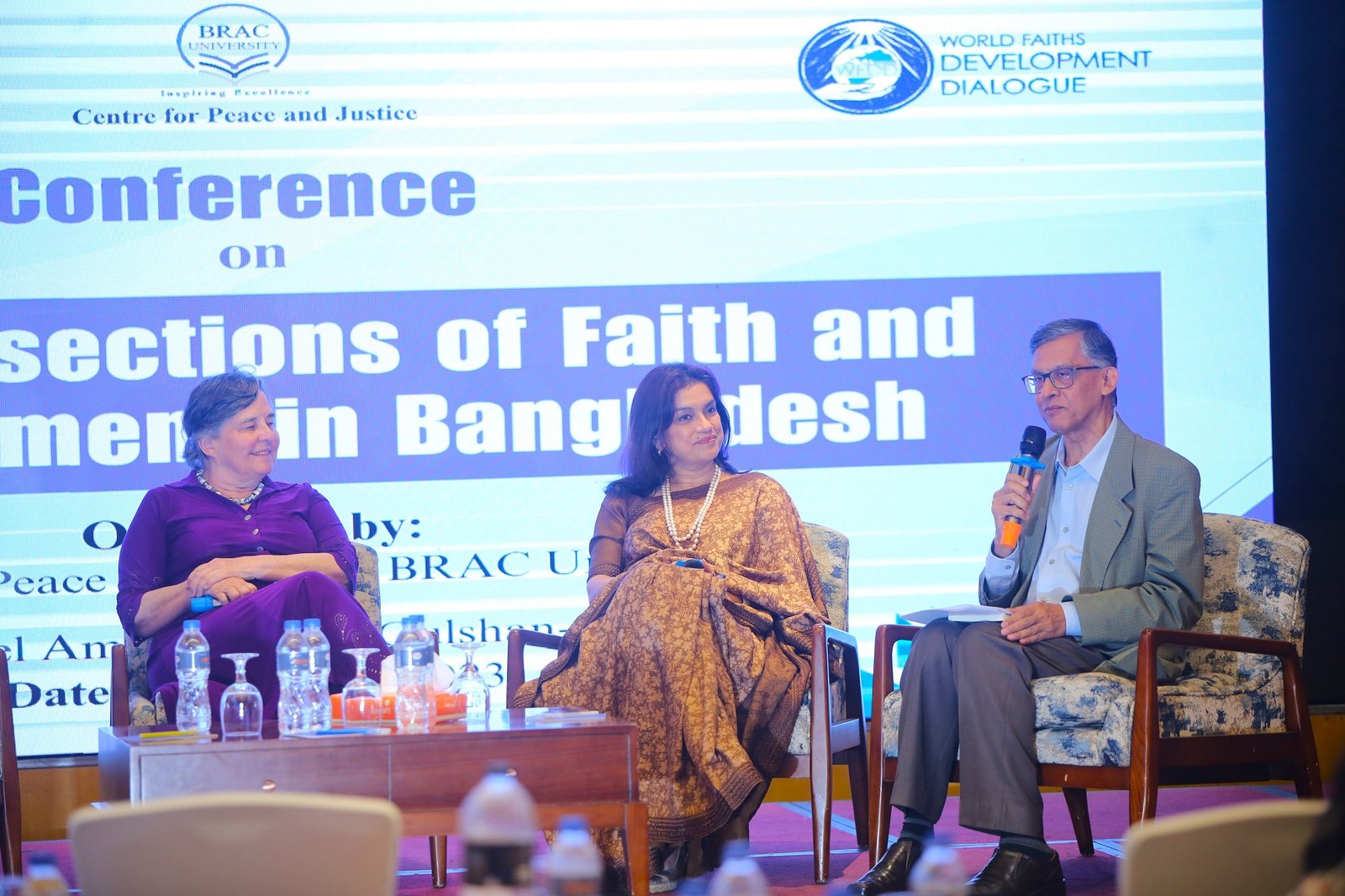 From left to right: Executive Director of the World Faiths Development Dialogue (WFDD), Prof. Katherine Marshall; Dean of General Education and Research Fellow at the Centre for Peace and Justice (CPJ), Brac University, Prof. Dr. Samia Huq; and Executive Director of CPJ, Brac University, Manzoor Hasan OBE.